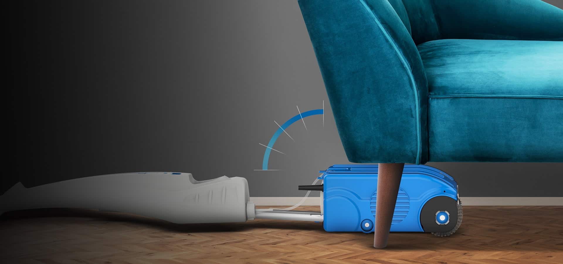 Floorwash kennt keine Hindernisse! Dank dem um bis zu 90° drehbaren Tank sind auch schwer erreichbare Stellen kein Problem: z. B. unter Möbeln mit 14 cm Höhenabstand zum Boden.